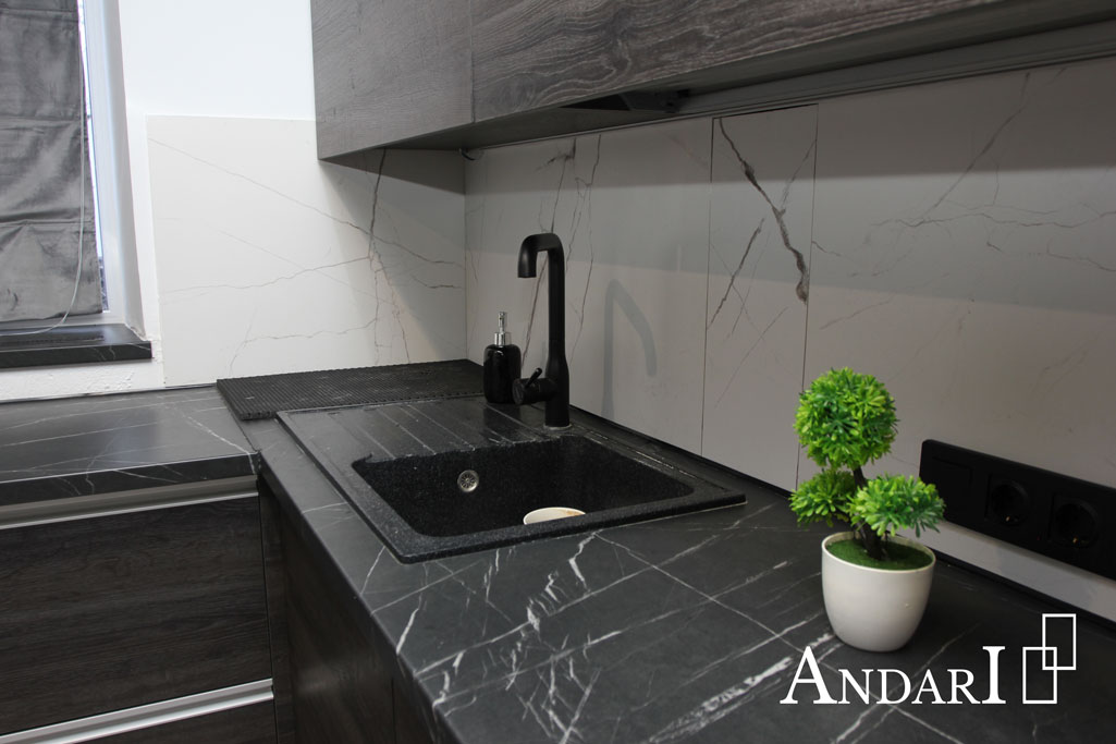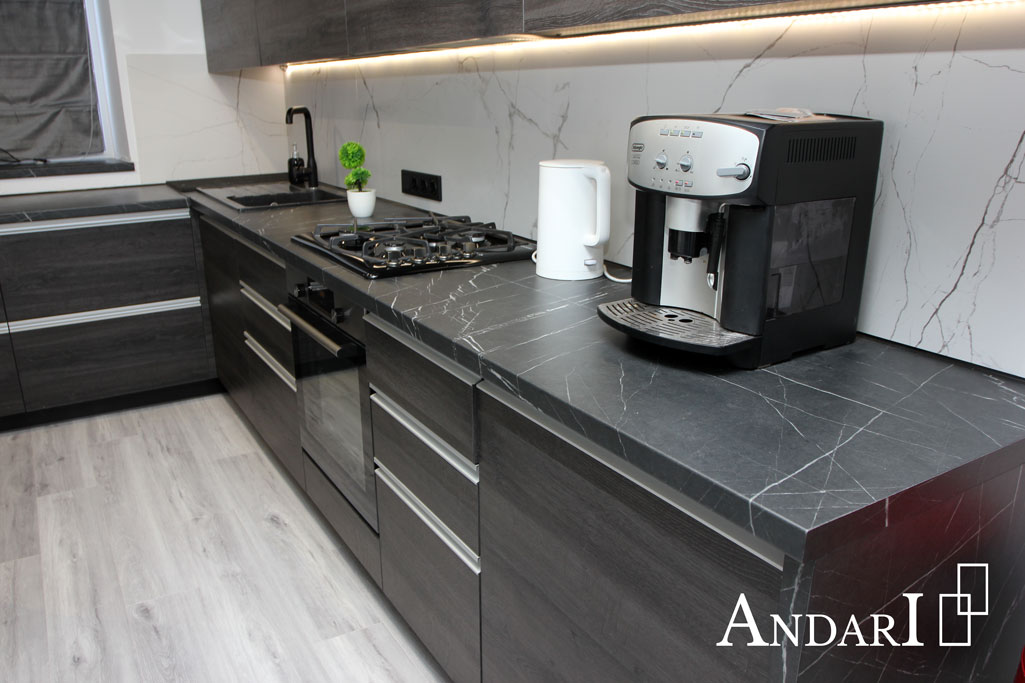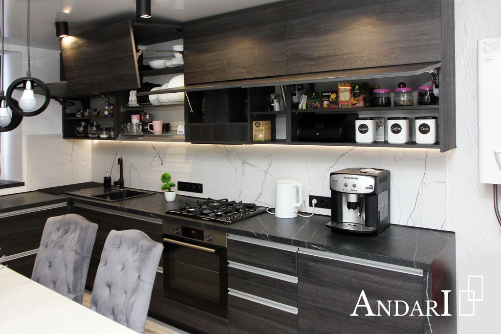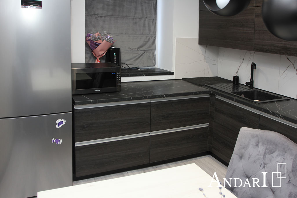 Угловая кухня до потолка с темными древесными фасадами сделана на заказ и установлена в частном доме. Кухня в современном стиле с алюминиевыми профильными ручками. Текстура фасадов из ЛДСП Egger с очень приятной поверхностью, напоминающей натуральное дерево, устойчивы к солнечным лучам и химическому воздействию. Это недорогой и практичный материал, используемый как для каркасов, так и для фасадов