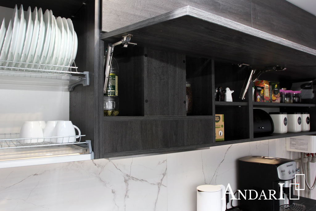 Все верхние фасады без ручек. Нижний ярус верхних фасадов открывается за счет свеса относительно корпуса корпуса. Верхний ярус фасадов открывается от нажатия по системе Tip-on Blumю Внизу все фасады с врезной профиль-ручкой алюминиевого цвета. Выдвижные ящики: Tandembox Blum. Вместо подоконника установлена столешница из постформинга с вентиляционными решетками для выхода теплого воздуха от отопления.