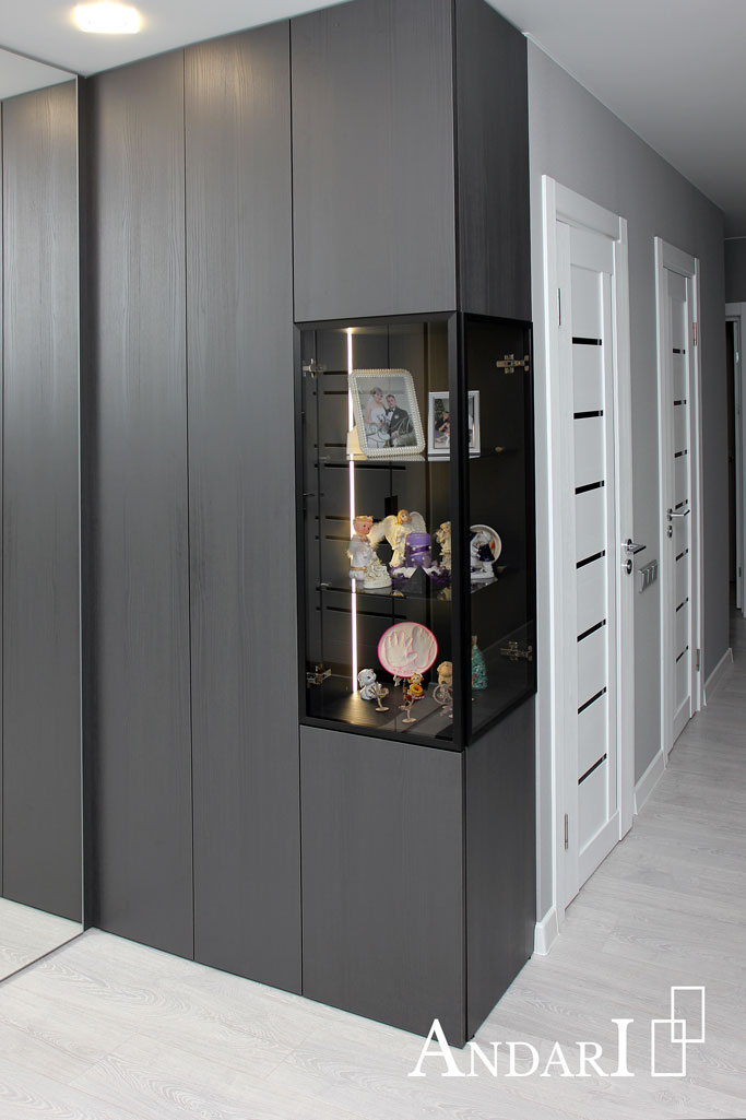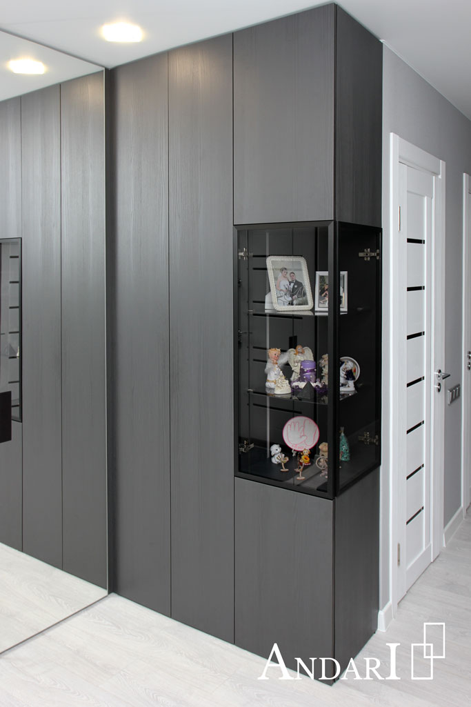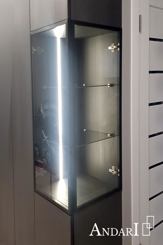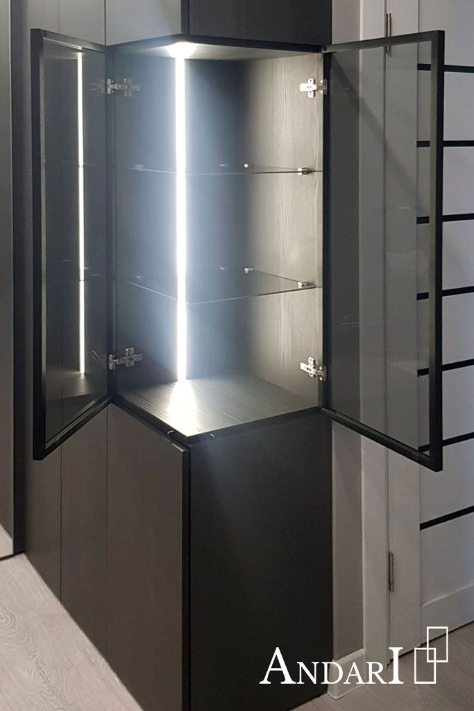 Справа установлен неглубокий прямой шкаф из ЛДСП черного цвета с витриной. Графитовое стекло оформлено в узкую алюминиевую рамку черного цвета. Внутри установлена врезная светодиодная подсветка и стеклянные полки. Все двери открываются от нажатия с помощью системы Tip-on BLUM