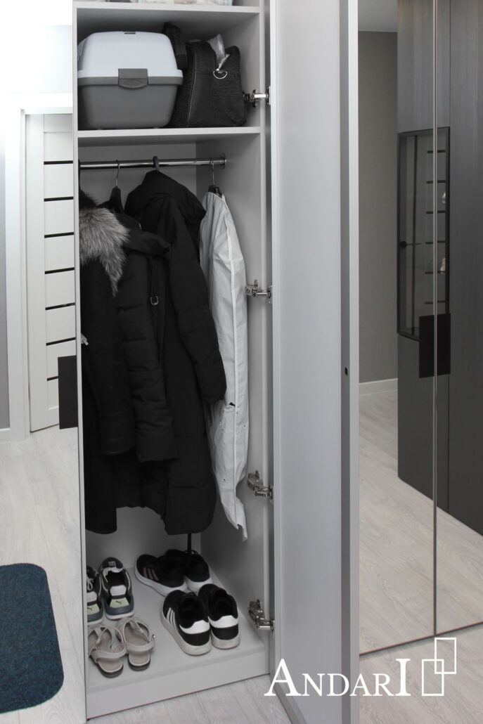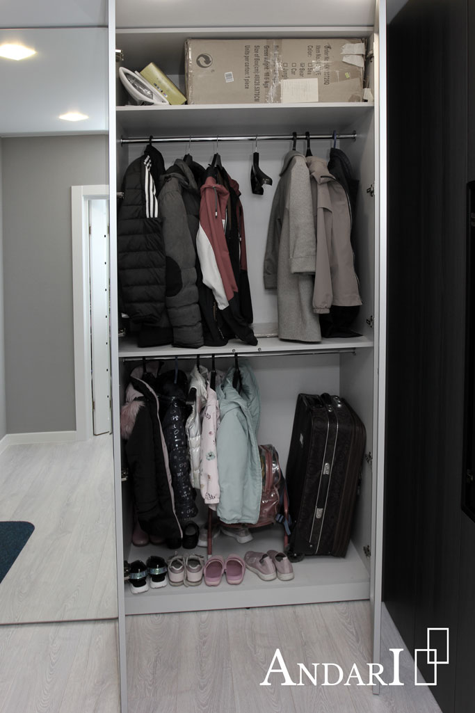 Комплект шкафов для прихожей изготовлен на заказ и установлен в квартире. Четырехдверный зеркальный шкаф глубиной 550 мм закрывает нишу. Все шкафы корпусные с боковыми и задними стенками подогнаны к стенам. Зеркальные двери сделаны максимальной высоты, чтобы не было видно цоколя.